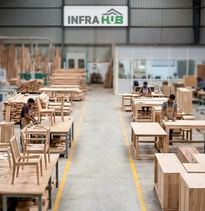 InfraHUB supplies furniture factory partners with high-quality materials to create precision-crafted pieces for residential, commercial, and office spaces, ensuring exceptional finishes.