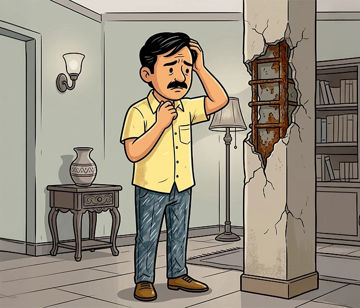 It usually begins as a faint, rust-colored stain seeping through the paint on a ceiling or the underside of a balcony. Then, long, straight cracks start to form along the concrete. Finally, without warning, a heavy chunk of concrete simply breaks off and crashes to the floor, revealing flaky, reddish-brown TMT steel bars beneath.